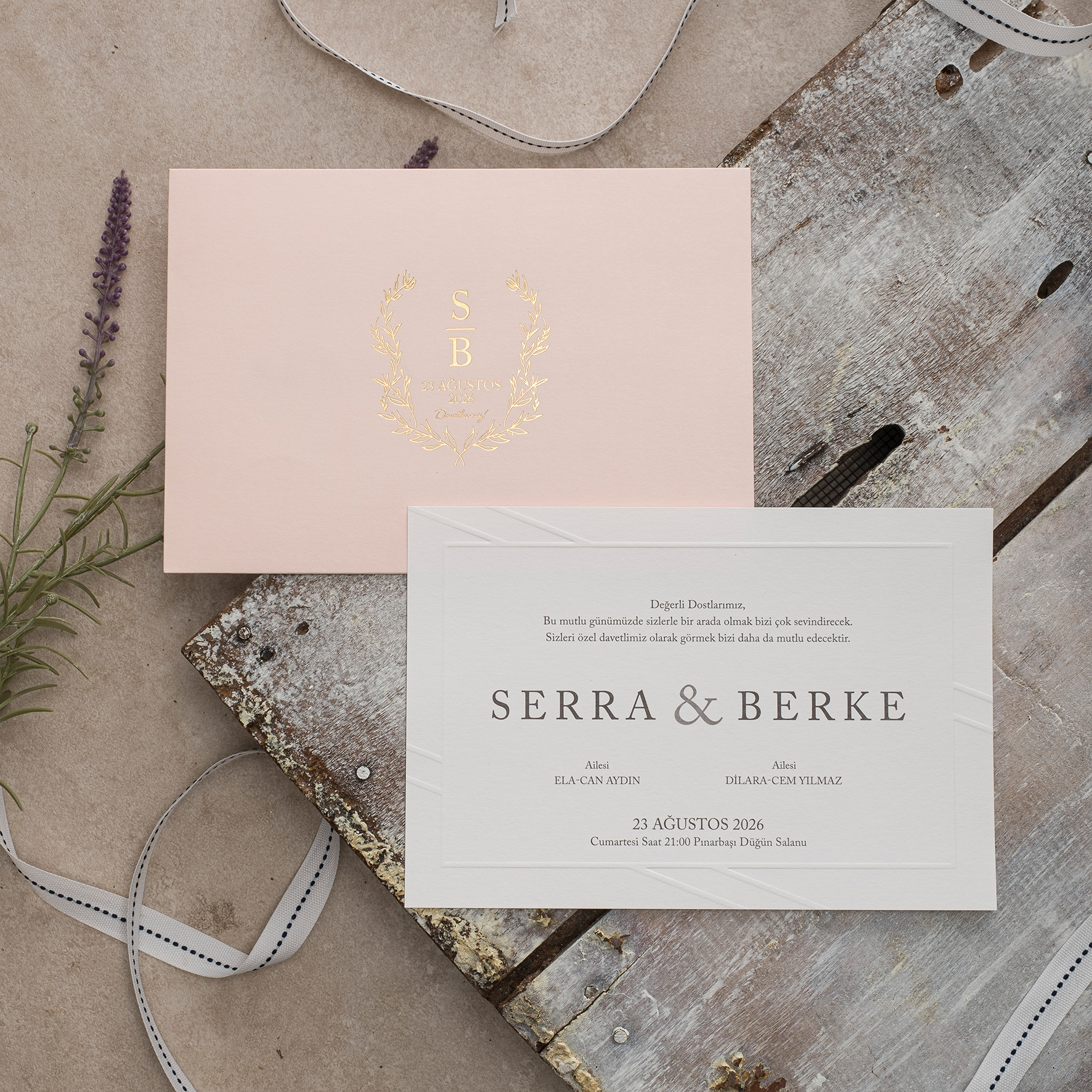 • Davetiye kutulu olarak tasarlanmış olup zarf ve aksesuarları içerisinde bulunmaktadır.